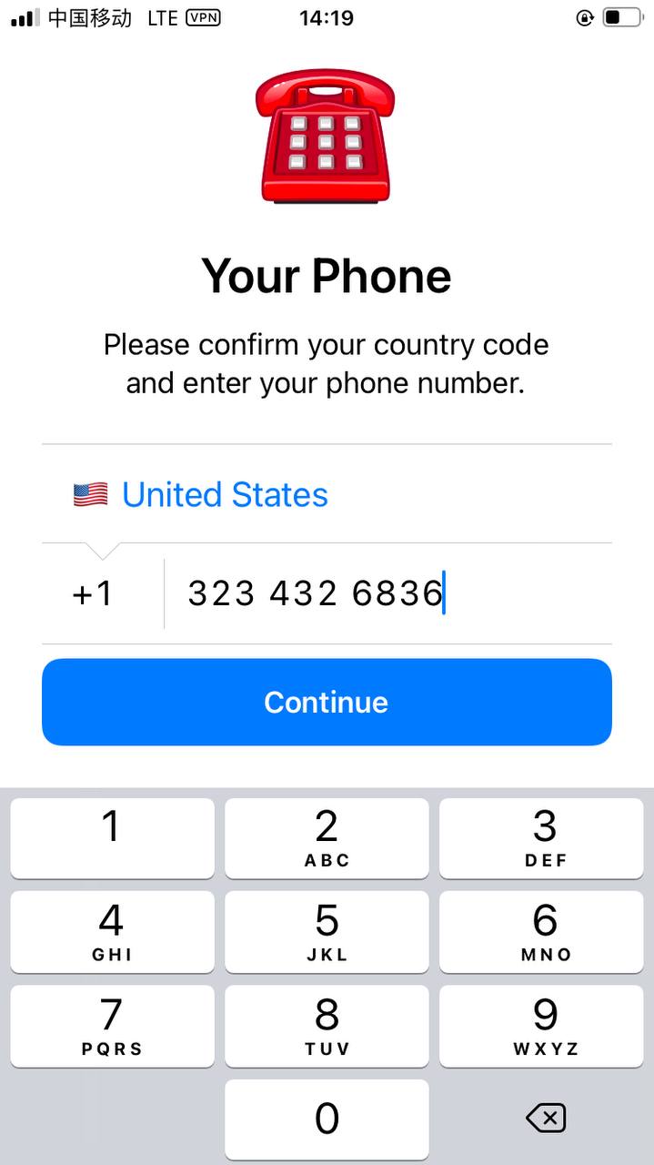 2、登录使用: 首先打开VPN然后打开app,选择国家代码(例如,+1),然后输入你购买的号码,如图: